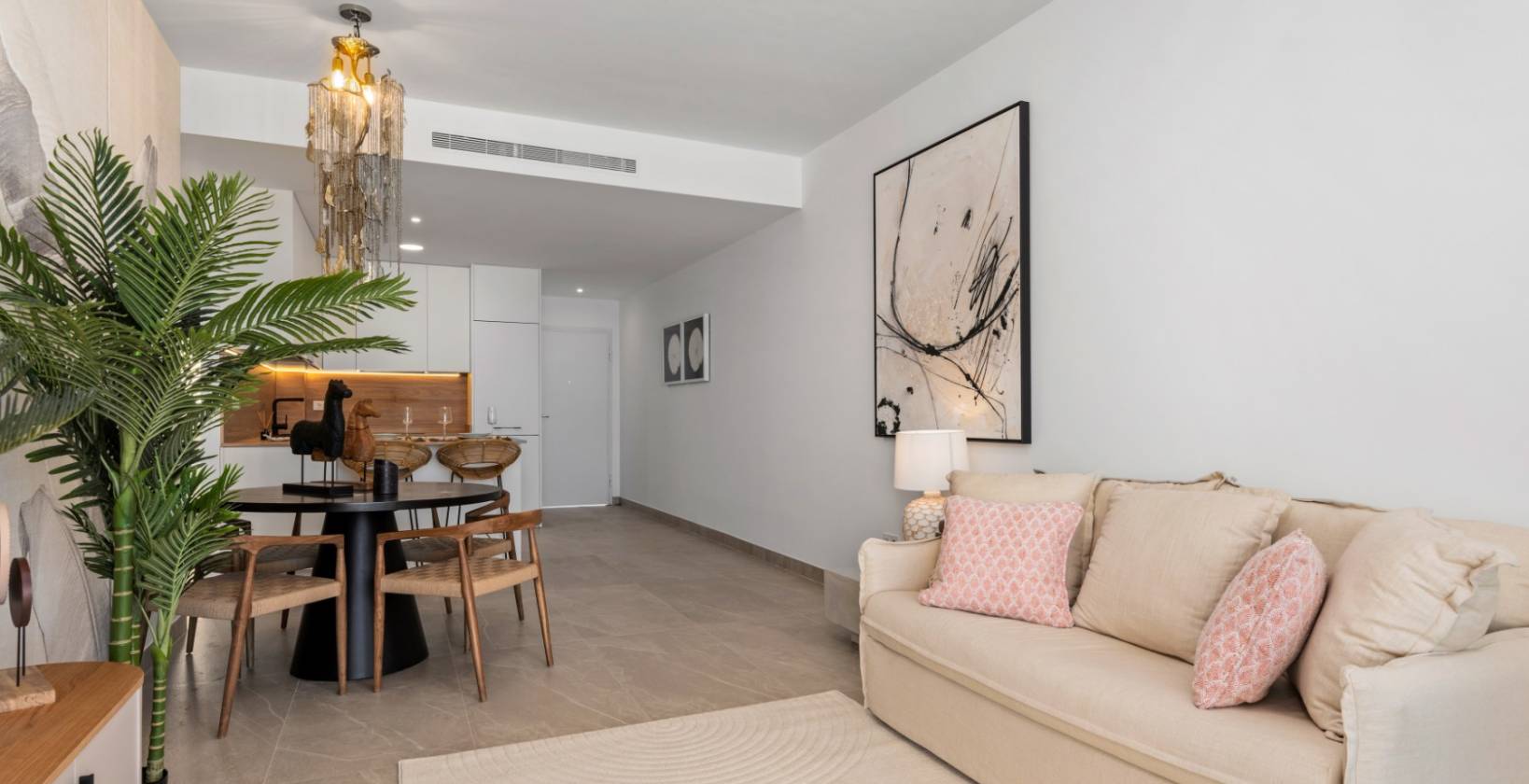Luxury flat with four (4) bedrooms can hardly be found anywhere ! Located on the ground floor, only 6.5 metres above street level, this one also has 2 bathrooms, one of which is en suite. The luxury kitchen is also equipped with all appliances with dishwasher. Large balcony of 21,80m2 ! The balcony is south-west facing with nice views. Around the corner you will already find the first nice Spanish bars, supermarket, bakery etc. You can leave your car on your own private parking space (optional) under the complex and take the lift to your flat. Many facilities within walking distance. Fantastic 4 bedroom flat which is also very suitable for permanent living.