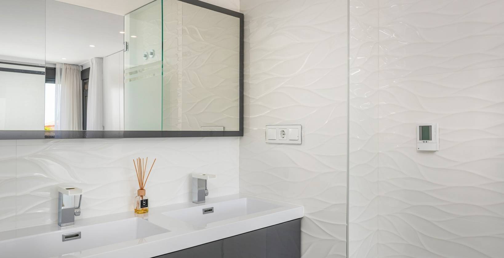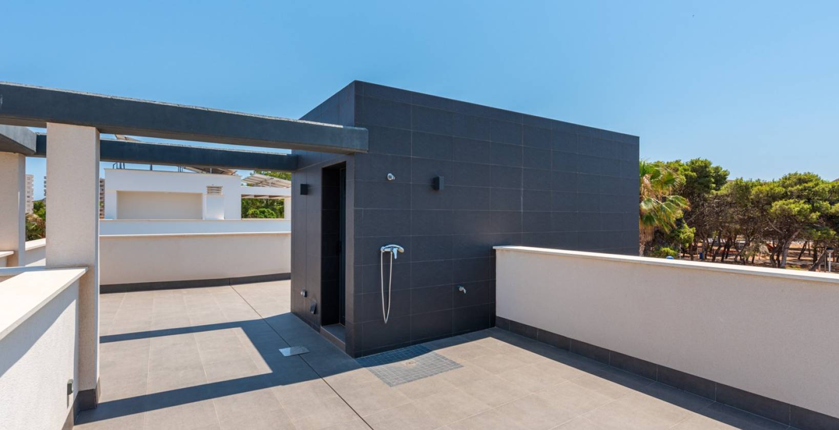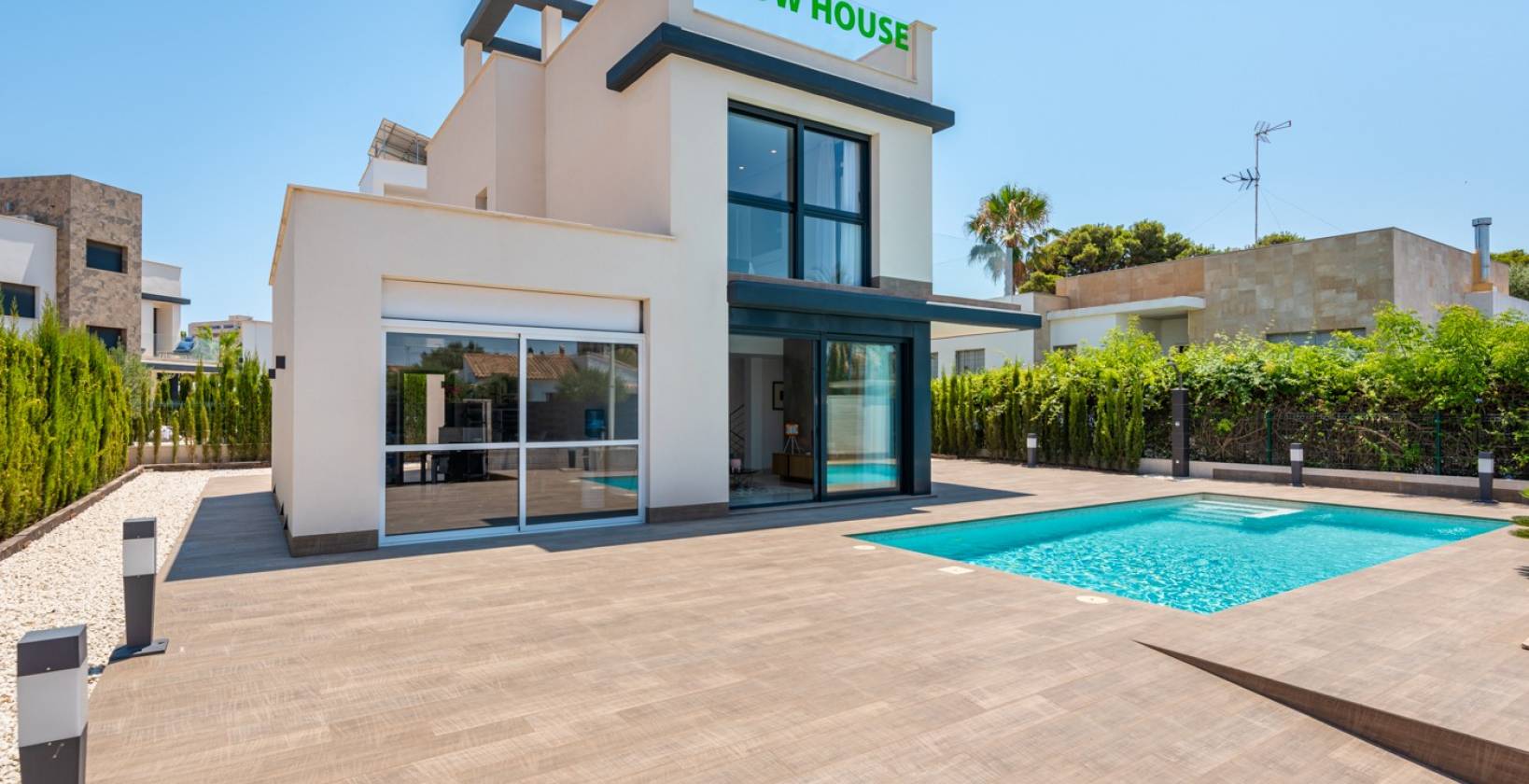 De villa beschikt over 3 grote slaapkamers en 3 badkamers, allen voorzien van vloerverwarming en vaste glaswanden. Bovendien is hij voorbereid op de toekomst met een meegeleverde oplader voor elektrische auto's, ontworpen voor wie op zoek is naar een moderne en duurzame levensstijl.