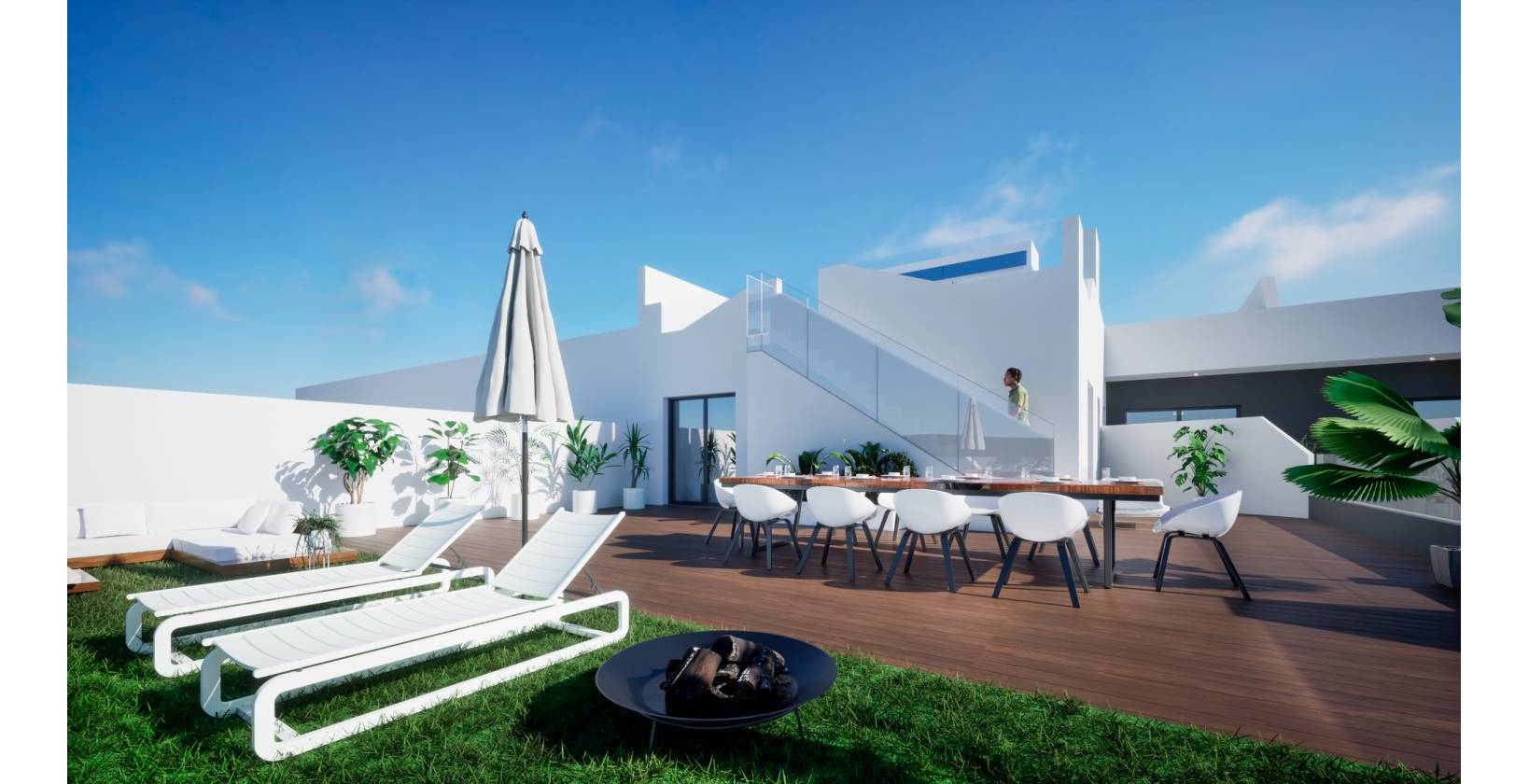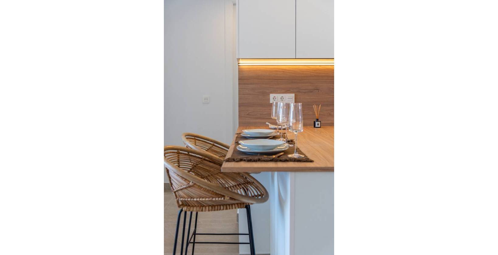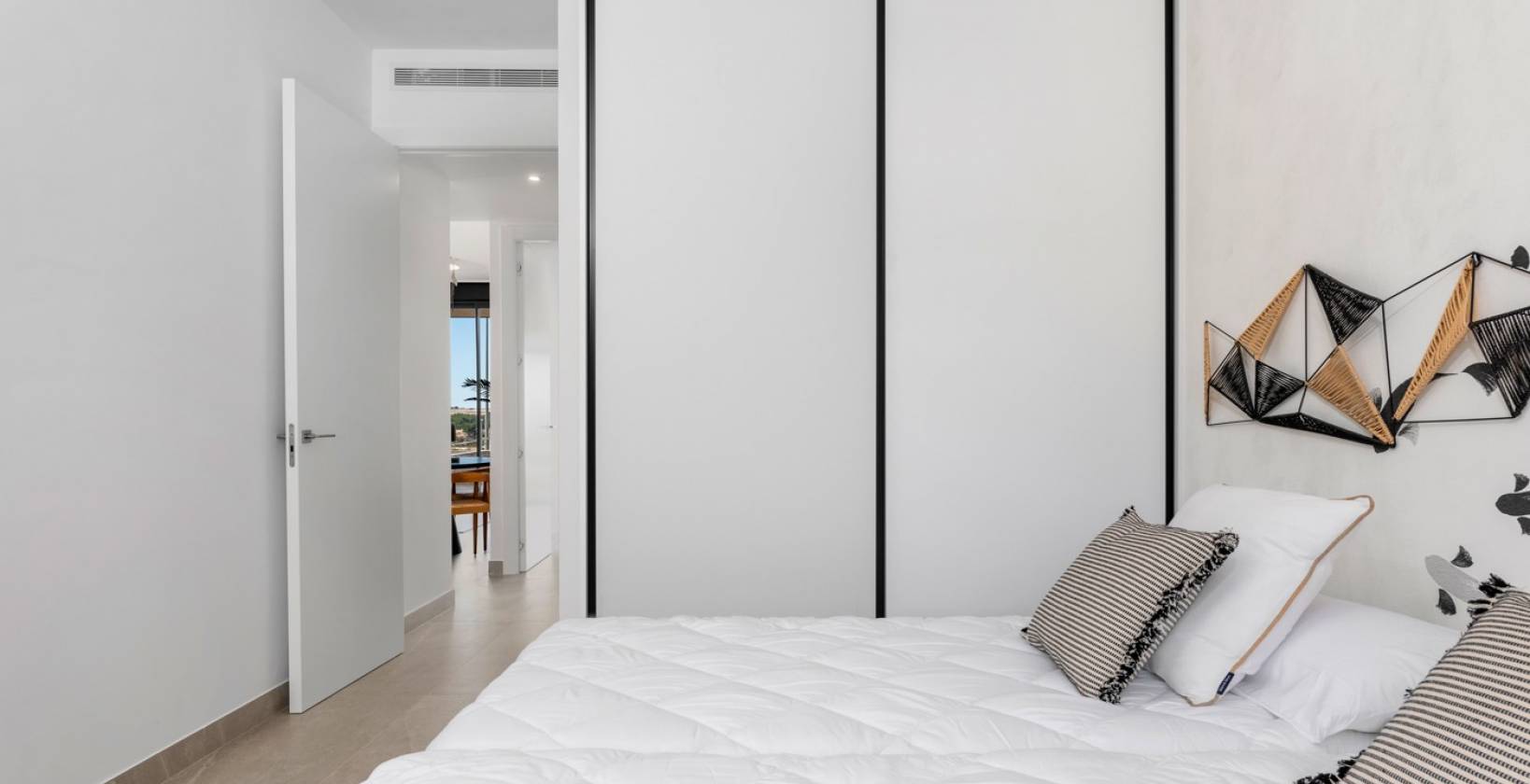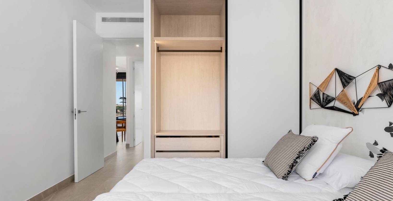 Het appartement beschikt over 4 (!) ruime slaapkamers en 2 luxe badkamers, waarvan één en-suite. Een andere slaapkamer geeft via schuifdeuren toegang tot het terras. Het appartement heeft ingebouwde kasten met lades en verlichting. De luxe keuken is inbegrepen in de prijs en is uitgerust met hoogwaardige, energiezuinige apparatuur, inclusief een vaatwasser.