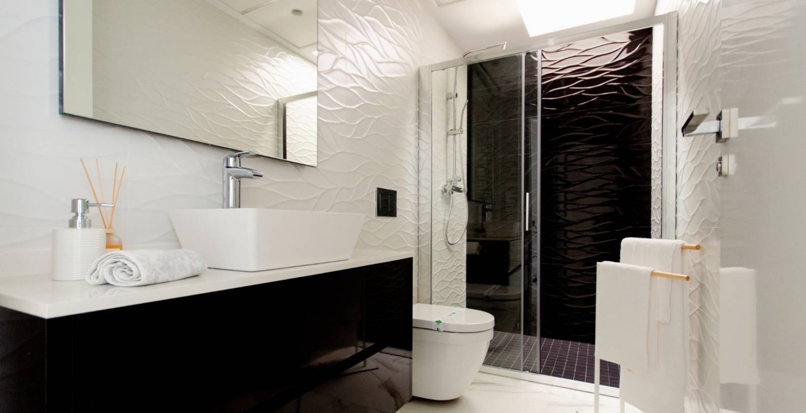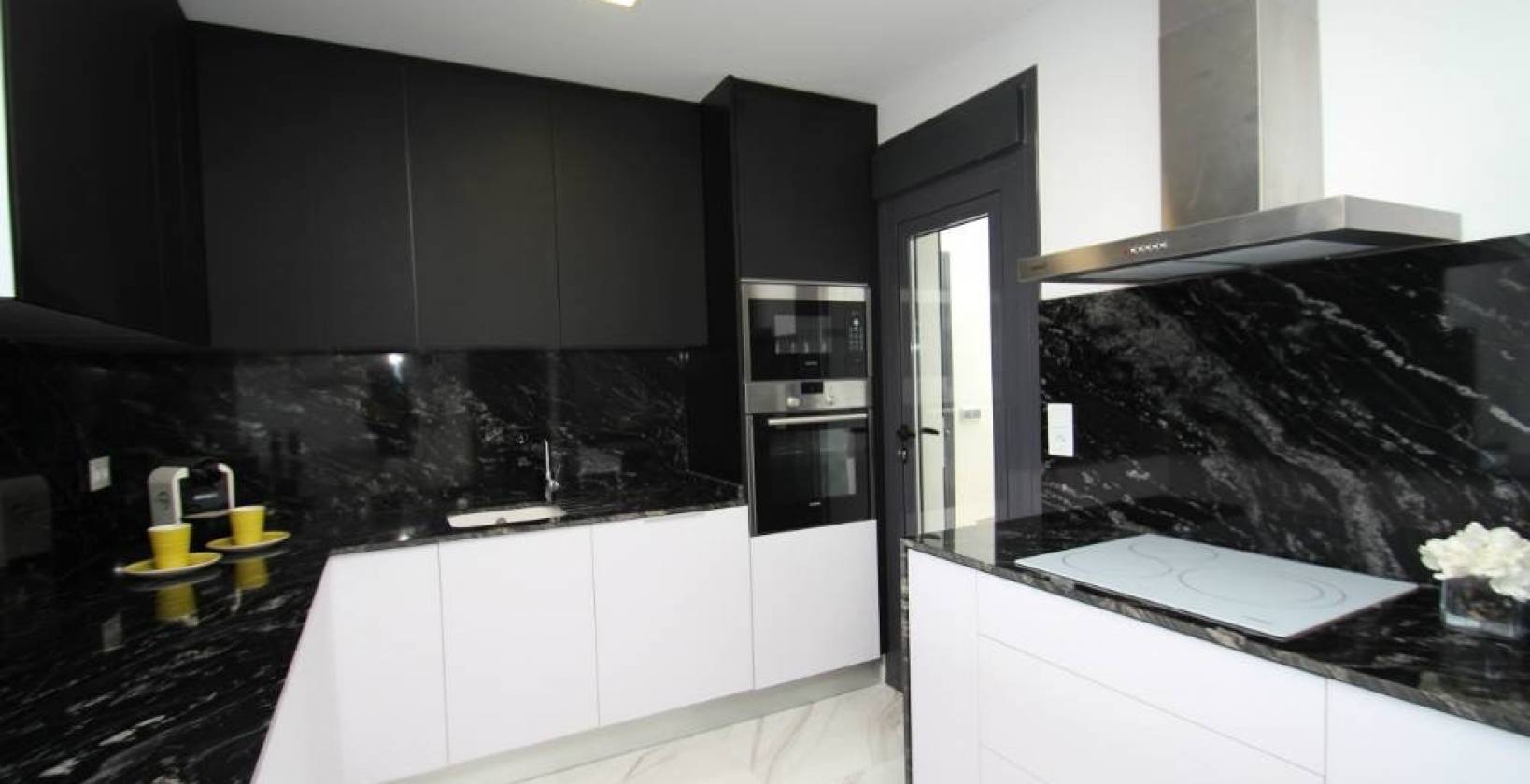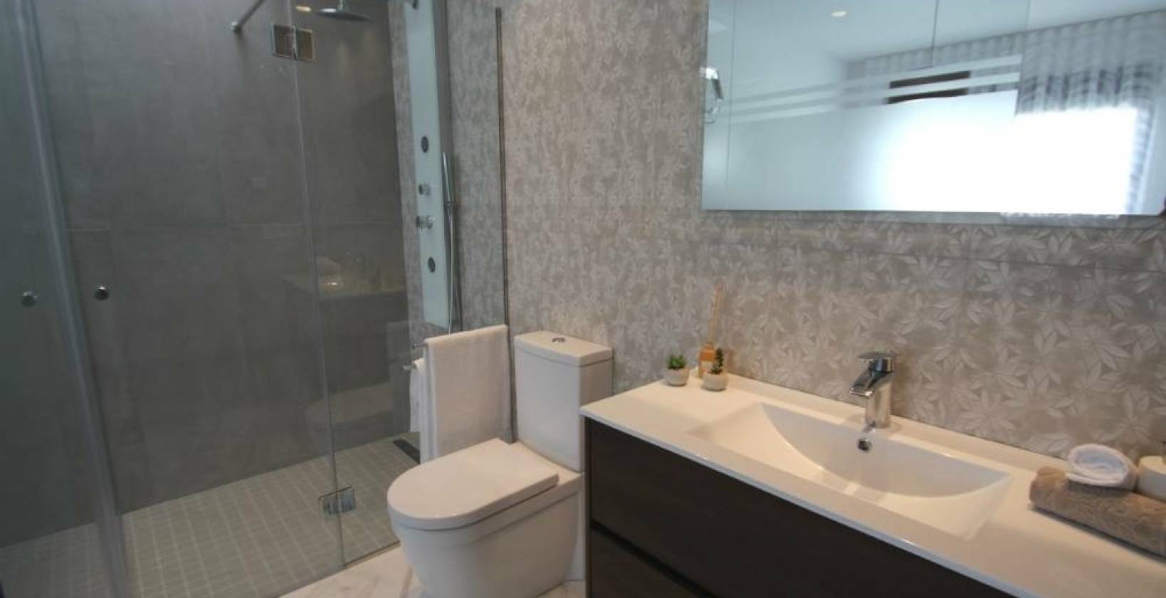 La villa cuenta con 2 amplias habitaciones y 2 baños, todos equipados con suelo radiante y mamparas de cristal fijo. Además, está preparada para el futuro con un cargador para coche eléctrico incluido, pensado para quienes buscan un estilo de vida moderno y sostenible.